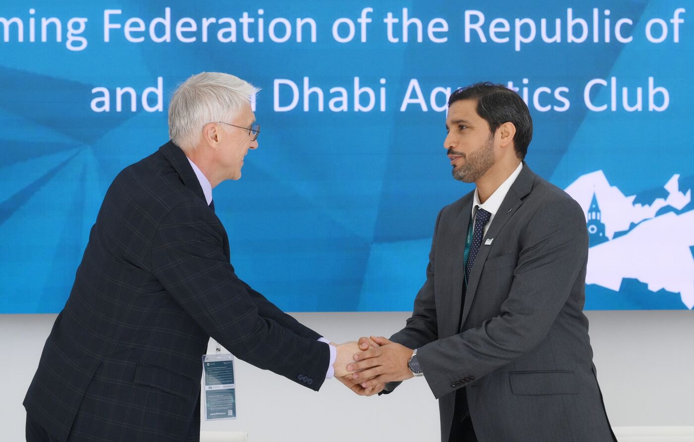 KAZANFORUM 2024. The ceremony to sign an Agreement on Cooperation between the Swimming Federation of the Republic of Tatarstan and Abu Dhabi Marine Sports Club. Erik Akchurin, First Deputy President and Executive Director, Swimming Federation of the Republic of Tatarstan; Saeed Al Jasmi, Vice President, Abu Dhabi Marine Sports Club. Photos can be used on the terms specified in the media bank's Forum section.